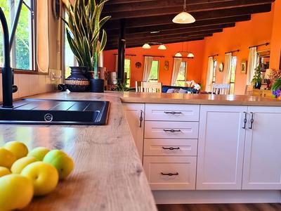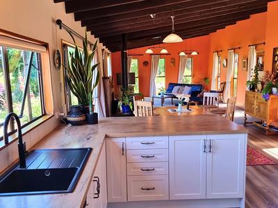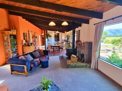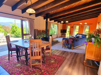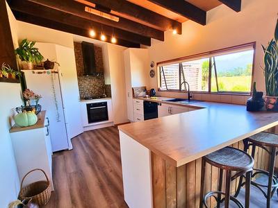 Step inside the 3 bdrm house and you'll immediately feel the calm and warmth of a home designed as a sanctuary. The spacious open-plan kitchen, dining, and lounge area with exposed beams form the heart of the home, flowing seamlessly to an expansive deck-perfect for entertaining or soaking up the tranquil rural outlook. A freestanding log burner with a timber mantelpiece and stone hearth adds character, ambience, and cosy winter warmth.